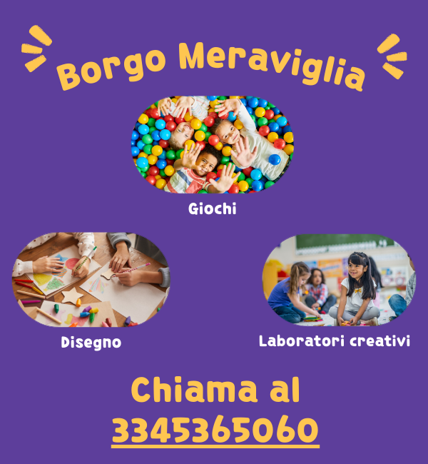 Borgo Meraviglia è lo spazio ricreativo per bambini a Roma che offre una miriade di attività adatte a bimbi di tutte le età: qui, in una sala strabordante di colori e risate, i bambini possono liberare la loro fantasia! Qui, tra giochi creativi e attività stimolanti, l’avventura e il divertimento non hanno mai fine. In questo mondo, tra attività stimolanti e giochi creativi, i bambini potranno saltellare, ridere e imparare, sviluppando la loro motricità e coordinazione. E c’è ancora di più! Grazie ai nostri laboratori artistici, potranno scatenare la fantasia e la creatività. Un luogo dove ogni giorno è una nuova avventura meravigliosa!